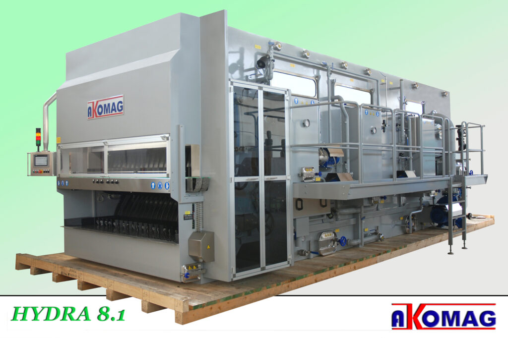 Per razionalizzare il ciclo di lavaggio, Akomag ha realizzato la serie HYDRA, una serie di macchine completamente automatiche che comprendono una prima stazione di svuotamento delle bottiglie seguita da spruzzatura di prelavaggio e un primo bagno di premacerazione. Questa configurazione consente di diminuire l’inquinamento del bagno detergente e abbattere i consumi. La tripla stazione d’estrazione delle etichette assicura il loro completo distacco dalle bottiglie usate, mentre il filtro rotante dislocato per tutta la larghezza della macchina ne garantisce l’evacuazione all’esterno. Il lavaggio delle bottiglie è completato con le spruzzature interne ed esterne che avviene con detergente ad alta pressione distribuito tramite ugelli rotanti autopulenti e autocentranti. Al completo risciacquo, invece, provvedono la fase di abbattimento dell’alcalinità seguita da spruzzature esterne e interne con acqua di rete. Anch’essa costruita in base alla direttiva macchine, la serie è dotata di diverse predisposizioni che ne aumentano la sicurezza, tra cui: installazione di sensori per il rallentamento e la fermata in caso di mancanza o intasamento di bottiglie sui nastri trasportatori; introduzione della soda liquida e additivi nel bagno detergente e di prodotti sequestranti e disinfettanti nelle vasche di spruzzatura. Il carico e lo scarico automatico delle bottiglie è perfettamente sincronizzato con il movimento della catena principale. La valvola economizzatrice per l’acqua di rete e il controllo automatico della presenza d’acqua completano l’ultima stazione di risciacquo. Altre dotazioni importanti sono: ripristino automatico degli scivoli di carico e scarico bottiglie dal quadro comandi; ingrassaggio raggruppato; variatore elettronico della velocità con comando a distanza (inverter); visualizzazione sul quadro comandi della velocità impostata; spruzzi rotanti autopulenti e autocentranti ad alta pressione; spruzzature esterne facilmente estraibili per manutenzione e pulizia; valvole per lo svuotamento dei maceri e delle vasche di spruzzatura; quadro comandi estraibile d’acciaio inox; impianto elettrico IP55; visualizzatore elettronico dei messaggi per un facile e totale controllo delle funzioni della macchina; manometri e termometri a portata visiva dell’operatore. All’altezza dello scarico delle bottiglie sono predisposte protezioni antinfortunistiche e antipolvere. Le sicurezze elettroniche su ogni riduttore permettono l’arresto della macchina in caso di sovraccarico. Lo scambiatore di calore e le pompe sono gli stessi della serie GENESI. Altissima automazione nel lavaggio e produttività s’incontrano nel modello HP della stessa serie. Malgrado la sofisticazione, basta un operatore per gestire a distanza l’intero ciclo di lavaggio, verificandone il funzionamento tramite i sistemi di controllo. I tubi di lavaggio esterno sono costruiti in modo da ridurre al minimo la manutenzione. Ma nel caso fosse necessaria, le operazioni di smontaggio e pulizia sono molto semplici. La regolazione delle temperature nelle vasche è automatizzata tramite sistema pneumatico proporzionale ad azione modulante, che offre garanzia di precisione e sicurezza di funzionamento. Sovradimensionata, la motorizzazione principale garantisce una lunga efficienza nel tempo riducendo al minimo l’usura meccanica. Il variatore elettronico di frequenza permette di gestire i principali motori installati nella serie HYDRA HP tramite un comando a distanza. La pressa automatica per la raccolta delle etichette evacuate dal bagno detergente è completa di un sistema di recupero della soluzione detergente che si accumula in fase di pressatura.