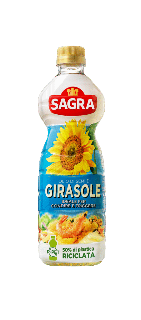 SAGRA, brand del Gruppo Salov S.p.A., conferma il proprio impegno nell’ambito della sostenibilità presentando le innovative bottiglie in r-PET realizzate con il 50% di plastica riciclata dedicate alla gamma di oli di semi da 1 litro.