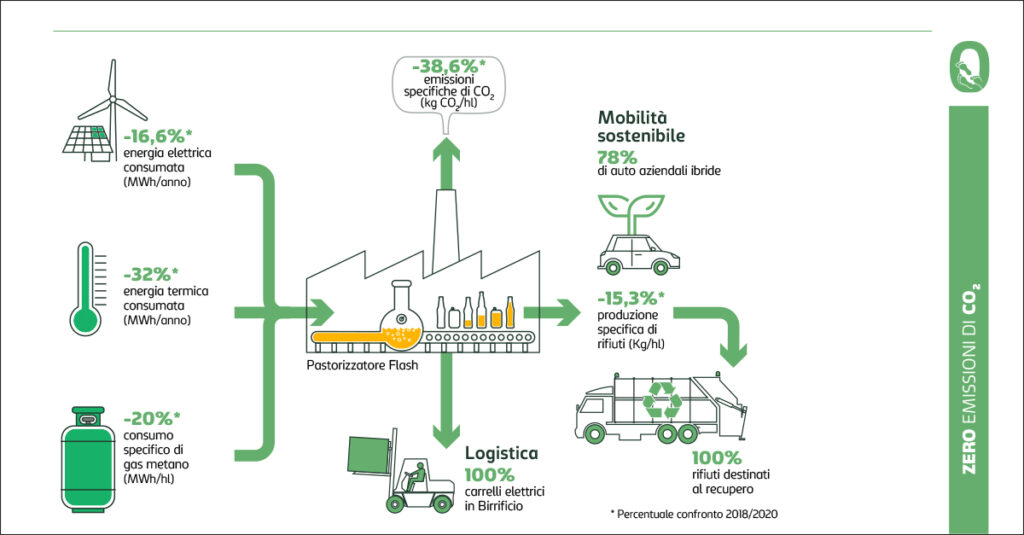 Per quanto riguarda il risparmio idrico, il principale investimento recente permette di dotare lo stabilimento di Induno Olona (VA) di un depuratore indipendente da quello consortile, che nell’ultimo anno ha permesso di depurare la totalità delle acque reflue, restituendo all’ambiente quasi 210mila metri cubi di acqua con qualità prossima a quella della fonte. Il risparmio idrico, inoltre, passa anche attraverso il riutilizzo di parte dell’acqua destinata al lavaggio bottiglie per il raffreddamento dei macchinari. Anticipando il target 2022, il consumo specifico di acqua per ettolitro di birra prodotta è oggi pari a 2,9 hl/hl.