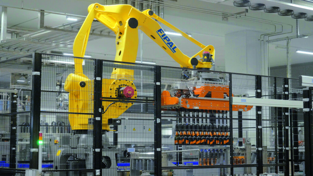 FALCON è il robot multifuzione a braccio antropomorfo che FIPAL ha inserito all’interno della sua gamma di macchinari per il fine linea. Disponibile nella versione a 4 o 6 assi, il robot può essere attrezzato con teste di presa per funzioni di palletizzatore, depalletizzatore, incartonatrice o incassettatice. Per tutte le applicazioni è possibile creare un’isola completamente automatica dove il robot esegue cambi formato (ed eventualmente cambi testata) in modo autonomo: l’operatore deve solo selezionare la ricetta corretta dall’apposito pannello HMI. Nello specifico dell’incartonamento è stata introdotta una nuova testata di presa a regolazione completamente automatica che consente di: regolare la distanza delle campanelle in base al diametro delle bottiglie; regolare il numero di campanelle i x j che configurano le bottiglie all’interno della scatola. Queste importantissime funzioni totalmente autonome consentono di avere numerosi vantaggi, uno su tutti quello di abbattere drasticamente i tempi di cambio formato, soprattutto quando vi sono variegati prodotti diversi da incartonare. Il robot FALCON permette quindi più svariate applicazioni, garantendo un’altissima flessibilità di utilizzo, un’altissima affidabilità e un’altissima precisione.