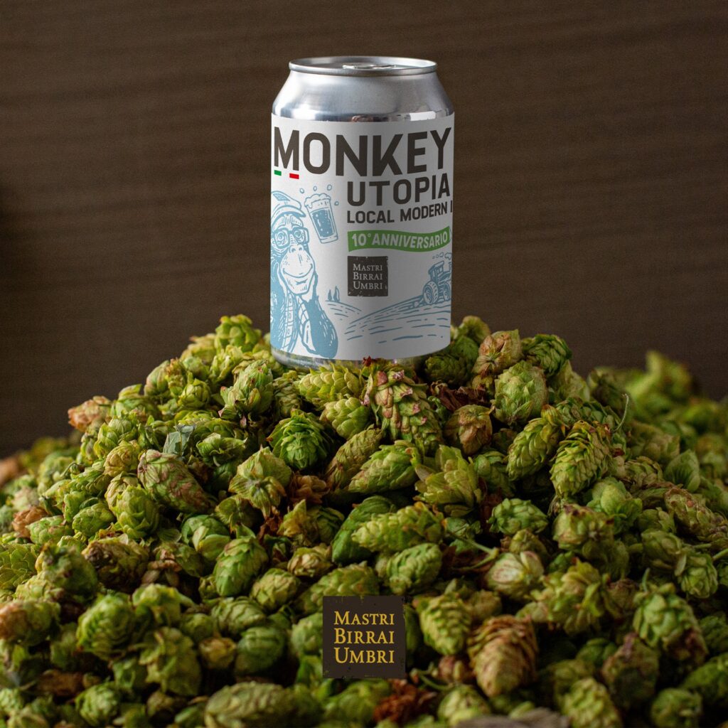 «Utopia è una Local Modern IPA prodotta con ingredienti umbri dalle peculiari note aromatiche. Di colore giallo intenso e velato, ha schiuma bianca, fine e persistente e profumi eleganti di erba tagliata, thè, pompelmo e mandarino. In bocca è equilibrata, con il frumento che dona morbidezza e bilancia l’aroma. Il dry hop rende più intensi e duraturi tutti i sentori. Corpo avvolgente, bollicina leggera. Sotto il profilo organolettico abbiamo puntato ad avere note aggrumate ed esotiche provenienti dalla tecnica del Double Dry Hop (DDH), secondo le più recenti evoluzioni di questo stile, ormai internazionale, ma in questo caso tutto il luppolo utilizzato proviene dai campi di Luppolo Made in Italy e rappresenta, quindi, una novità assoluta nel settore della birra artigianale italiana. Quando siamo stati per la prima volta a visitare i luppoleti a Città di Castello con i ragazzi di Luppolo Made in Italy ci siamo subito resi conto della loro professionalità e passione e della qualità dei luppoli che stavano facendo crescere. Mentre tornavamo verso casa ci è venuta un’idea folle: “E se invece della solita Harvest ci spingessimo ancora oltre quest’anno con una birra DDH IPA 100% Italiana?” Dal giorno dopo ci siamo messi subito al lavoro per trasformare questa “Utopia” in realtà, anche perché volevamo celebrare i 10 anni di attività di Mastri Birrai Umbri nel miglior modo possibile, rispettando la nostra filosofia produttiva con una birra 100% da filiera agricola italiana e innovando la nostra linea di birre Monkey con la ricetta che ci mancava, una Modern IPA».