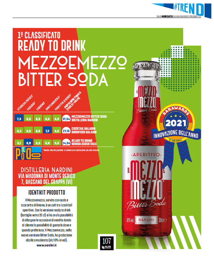 Il Mezzoemezzo Bitter Soda è stato premiato nel corso della Barawards Gala Evening tenutasi al Superstudio Più di Milano, convincendo i lettori e l’esperta giuria nella categoria ready-to-drink. L’aperitivo firmato Nardini ha ottenuto i punteggi più alto in assoluto della categoria nei parametri “Attinenza al mercato” e “Prospettive di vendita”, dimostrandosi il prodotto che più di tutti sta seguendo i trend del mercato moderno.