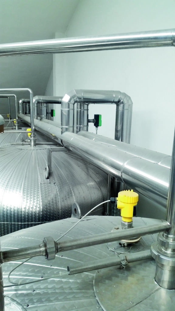 I sensori VEGA accompagnano il vino passo dopo passo nel corso della lavorazione fin dal 2004, anno di costruzione della cantina automatica. Il setup fu realizzato da un’azienda esterna incaricata della fornitura del sistema automatizzato. Gli strumenti sono impiegati per l’automazione del processo di stoccaggio del vino nei serbatoi (controllo di livello statico) e per le procedure di movimentazione del vino (misura continua di livello nei serbatoi di ingresso o di imbottigliamento). Nel corso degli anni si sono aggiunti numerosi altri sensori VEGA. Oggi si contano tra l’altro più di 60 sensori VEGAFLEX in oltre 50 serbatoi. Il sensore radar ad onda guidata viene impiegato per la misura di livello e interfaccia su qualsiasi tipo di liquido ed è un vero e proprio tuttofare. Grazie alla sua versatilità è presente in quasi tutti i settori, quindi anche presso Cavit. L’esecuzione di una misura corretta è resa difficile soprattutto dalla variazione delle condizioni ambientali, ad esempio della temperatura. Si deve però tener conto anche di eventuali agitatori all’interno dei serbatoi e dei requisiti di igiene e pulizia richiesti nell’industria alimentare. Di conseguenza si impiegano anche altri sensori di VEGA.