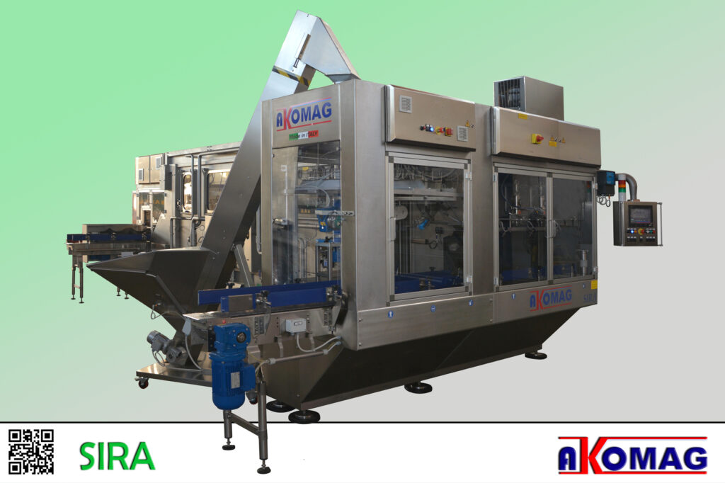 Il monoblocco per boccioni SIRA è una macchina studiata e progettata da Akomag per il lavaggio e la sterilizzazione di boccioni in PET o PC di varie misure e formati per la preparazione al successivo riempimento con acqua piatta.