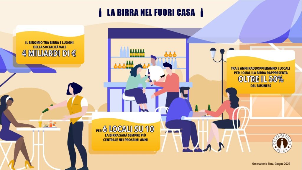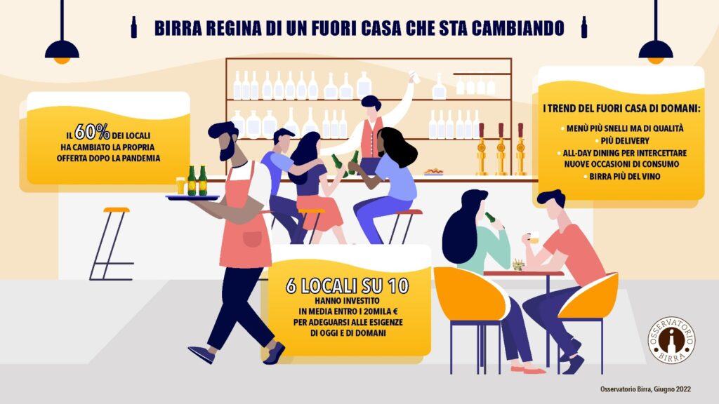 Già oggi la birra è un ingrediente strategico per la ripresa dei luoghi del fuori casa, dove questa bevanda ha un peso strategico sempre più rilevante, con un valore condiviso di 4.385 milioni di euro. In generale, gli addetti ai lavori del fuori casa apprezzano la dimensione socializzante della birra nei locali. Se per il 35,9% dei locali italiani la birra è già oggi centrale nella propria offerta (e per questo non crescerà in futuro), il 60,6% dei rispondenti dice che ci sarà sempre più birra domani nei loro locali, principalmente per 3 ragioni: è sempre più richiesta; è poco o per nulla alcolica (e questo chiedono molti giovani); infine, permette una buona marginalità.