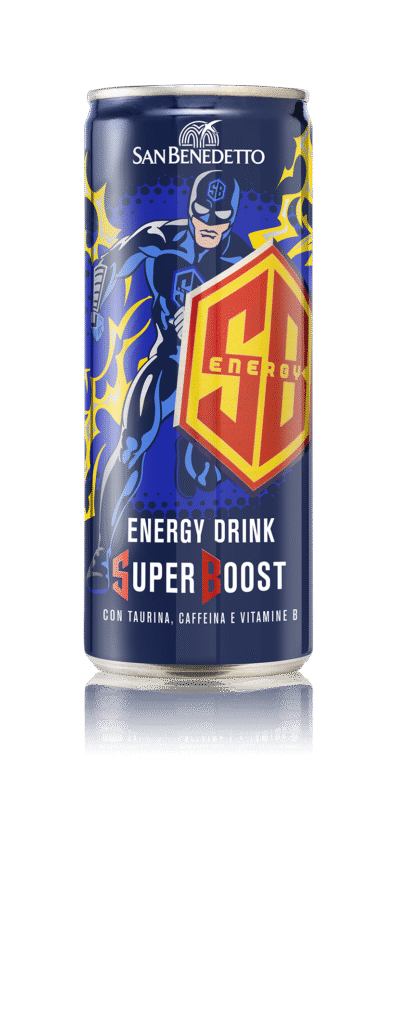 San Benedetto SB Energy Super Boost, l’energy drink a base di taurina, caffeina e vitamine del gruppo B, che contribuiscono al normale metabolismo energetico e alla riduzione della stanchezza fisica. Il suo design fresco e colorato, nel formato lattina da 0,25l, e la sua grafica con richiami al mondo energetico dei supereroi, rendono San Benedetto SB Energy Super Boost un must have in tutte le occasioni della giornata che richiedono una sferzata di energia.