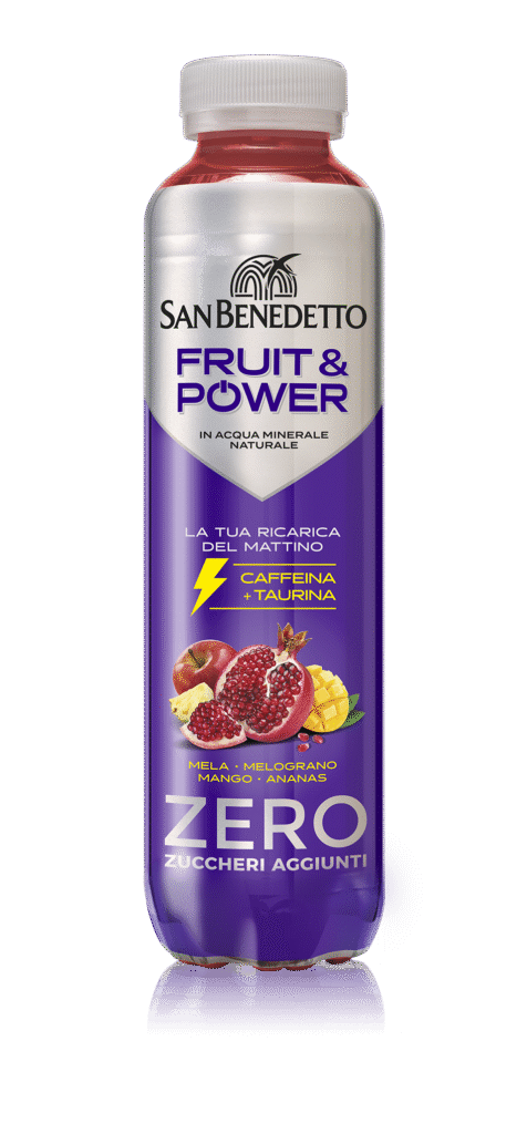 San Benedetto Fruit & Power, una carica gustosa e fresca alternativa al caffè, con tutto il buono della frutta in acqua minerale naturale e l’energia di caffeina e taurina, zero zuccheri aggiunti. Il design dell’etichetta valorizza i plus del prodotto attraverso un design fresco e lineare, per esaltare al meglio le proprietà energetiche e la freschezza della frutta. Disponibile nel pratico formato da 0,40 l in Pet, San Benedetto Fruit & Power è perfetto per una ricarica a colazione o un break energizzante.