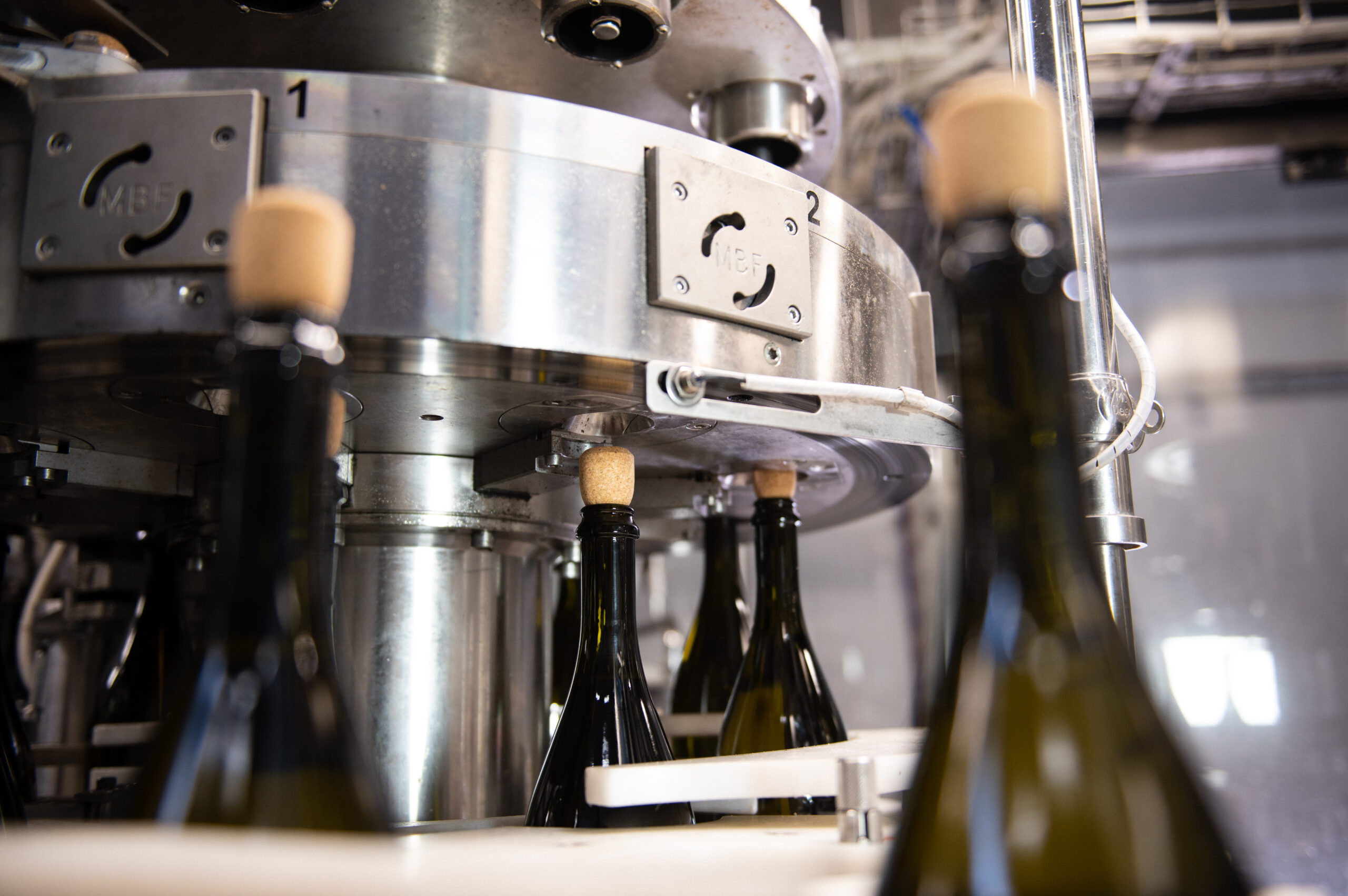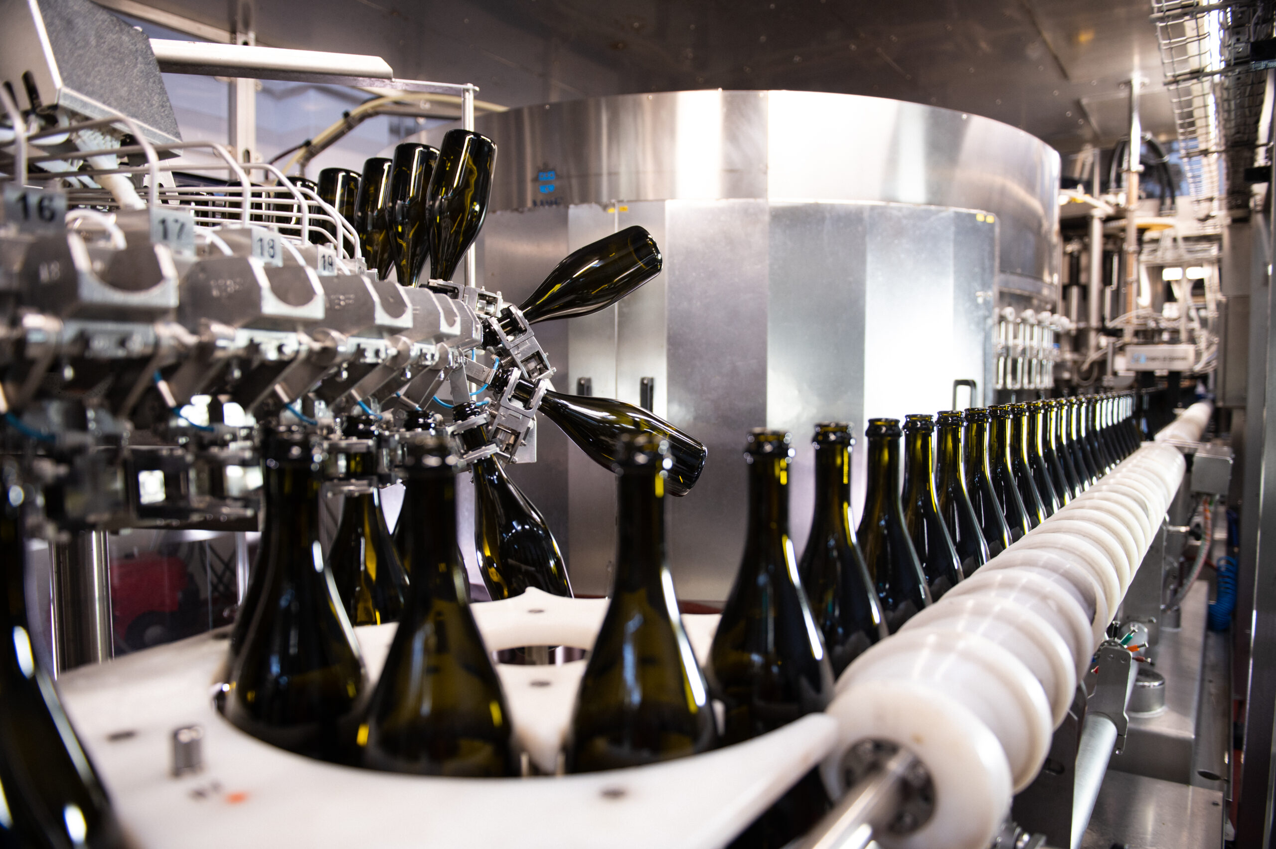 Due le linee di imbottigliamento che operano all’interno dello stabilimento produttivo: la prima, da 64.000 bottiglie al giorno, lavora i formati 0,75 e 1,5 litri, mentre la seconda, più recente, è in grado di ultimare, quotidianamente, fino a 75.000 bottiglie nei formati 0,187, 0,20 e 0,75 litri, con velocità che si attestano su 8.000 b/h per lo spumante e 10.000 b/h per il vino frizzante. Tutte le macchine di quest’ultima linea risultano facilmente regolabili, a seconda dei formati, sincronizzate tra loro da un PLC che dirige il movimento dei nastri, mantenendo separate le bottiglie per ridurre al minimo i rumori di contatto tra i vetri.