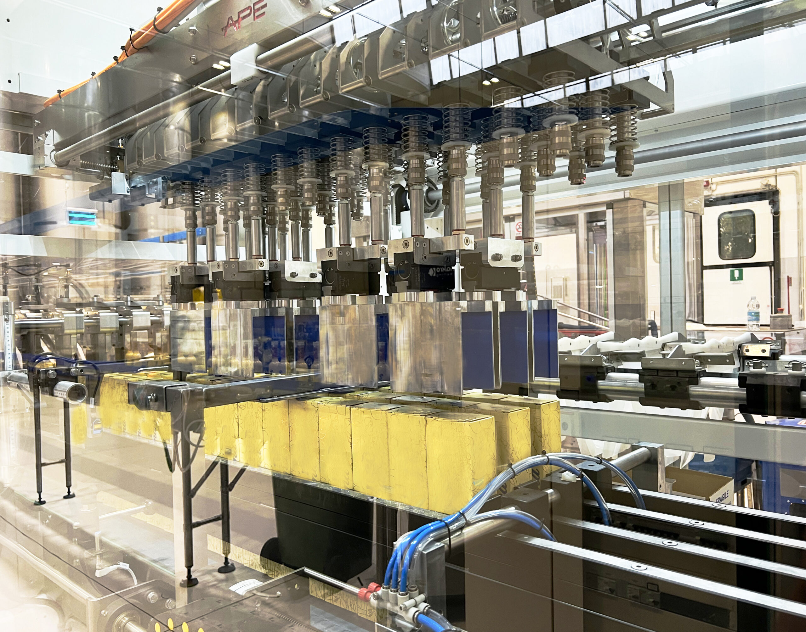 Nel progetto studiato da APE, studiato per adattarsi alle due linee di imbottigliamento – una principale da 15.000 bottiglie per ora e una per i formati ad alta rotazione da 8.000 BpH – il cuore del confezionamento è l’incartonatrice Inca Robot, scelta dal cliente per le sue caratteristiche specifiche: completamente autoregolante e dotata di testata di presa multiformato per bottiglie cilindriche e ovali, la macchina è infatti in grado di lavorare un’ampia gamma di formati e astucci grazie al divider per la distribuzione dinamica del prodotto su più file, con controllo della pressione in accumulo. «Tutte le macchine utilizzate sono 4.0 e comunicano con i sistemi di supervisione aziendali – sottolinea Franco Grappoli di Ape Impianti -. Grazie al nostro approccio custom made siamo in grado di mettere a disposizione del cliente dati di produzione, intervalli di manutenzione programmata e teleassistenza da remoto in tempo reale».
