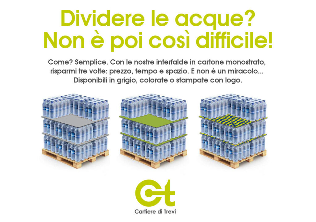 Le interfalde non solo migliorano la logistica, ma possono anche essere utilizzate come un efficace canale di promozione del tuo brand, con messaggi pubblicitari personalizzati per il pubblico di riferimento. Scegli le nostre interfalde in cartone per dividere, stabilizzare e impilare le bottiglie d’acqua minerale sui pallet in modo economico ed efficace.