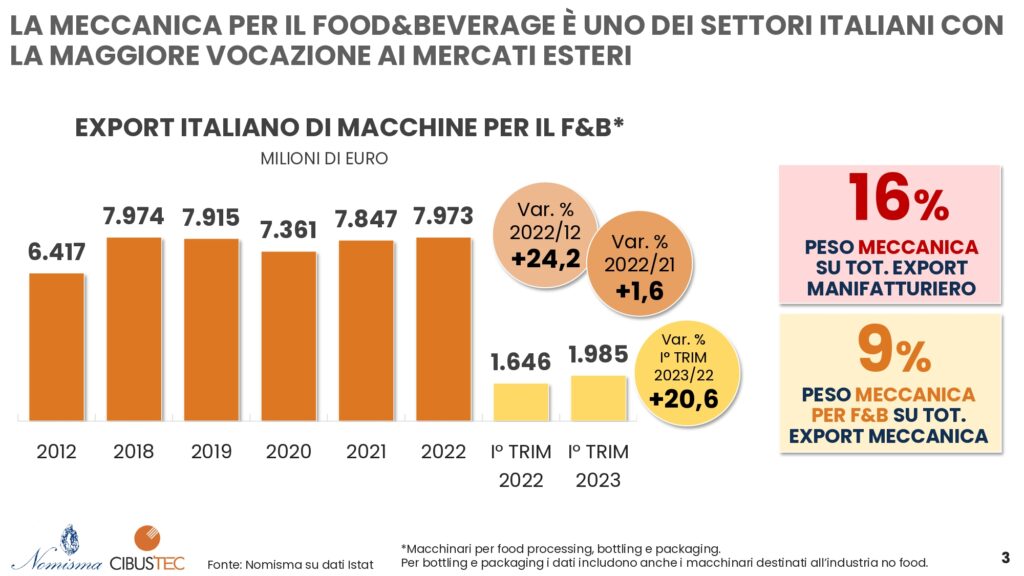 Grazie a un export di 8 miliardi di euro nel 2022 (+24,2% rispetto al 2012), la meccanica per il food&beverage (food processing, bottling e packaging*) rappresenta uno dei settori del Made in Italy più vocato ai mercati internazionali. I dati mostrano infatti una performance molto positiva anche nei primi 3 mesi del 2023 con un +20,6% rispetto al I trimestre 2022.