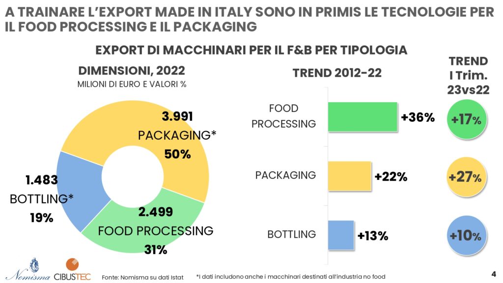 Quali sono le tipologie di macchine più esportate dell’Italia? La metà dell’export riguarda macchinare e apparecchi dedicati al packaging per un valore di 4 miliardi di euro nel 2022; seguono le tecnologie dedicate al food processing (2, 5 miliardi di export e peso del 31%) e a seguire le macchine per l’imbottigliamento (1,5 miliari di export e incidenza del 19%).