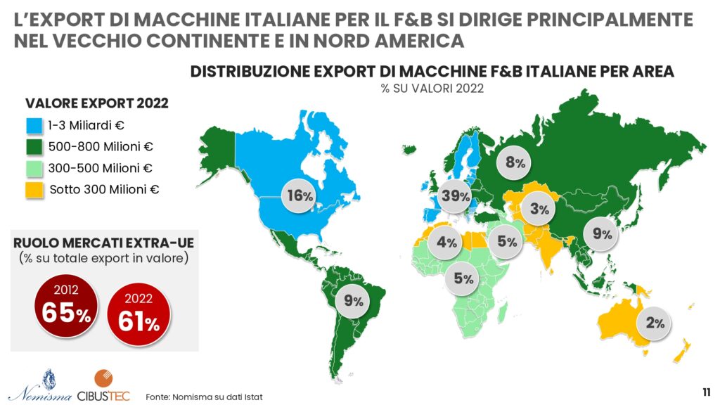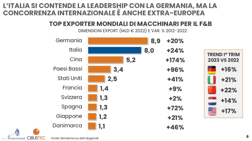 L’Italia rappresenta il secondo esportatore mondiale (dopo la Germania) di macchine e tecnologie per il food&beverage con una quota di mercato sul totale dell’export globale del 18%, incidenza che sale al 26% se si considera il peso sull’export europeo. Insieme Germania (export di 8,9 miliardi di euro) e Italia rappresentano ben il 38% dell’export mondiale di settore.