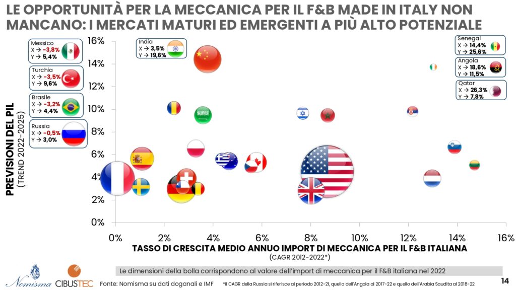 In generale, la domanda di tecnologia per il food&beverage continua a crescere nel mondo: nel 2022 le importazioni globali hanno superato i 42 miliardi di euro, +38% rispetto al 2012. Gli Stati Uniti, con un import pari a 7 miliardi di euro, sono i principali importatori mondiali; in seconda e terza posizione troviamo rispettivamente Cina e Germania con valori di importazioni di circa 2 miliardi di euro nel 2022 e poi a seguire Francia (1,6 miliardi di euro) e Canada (1,4 miliardi di euro).