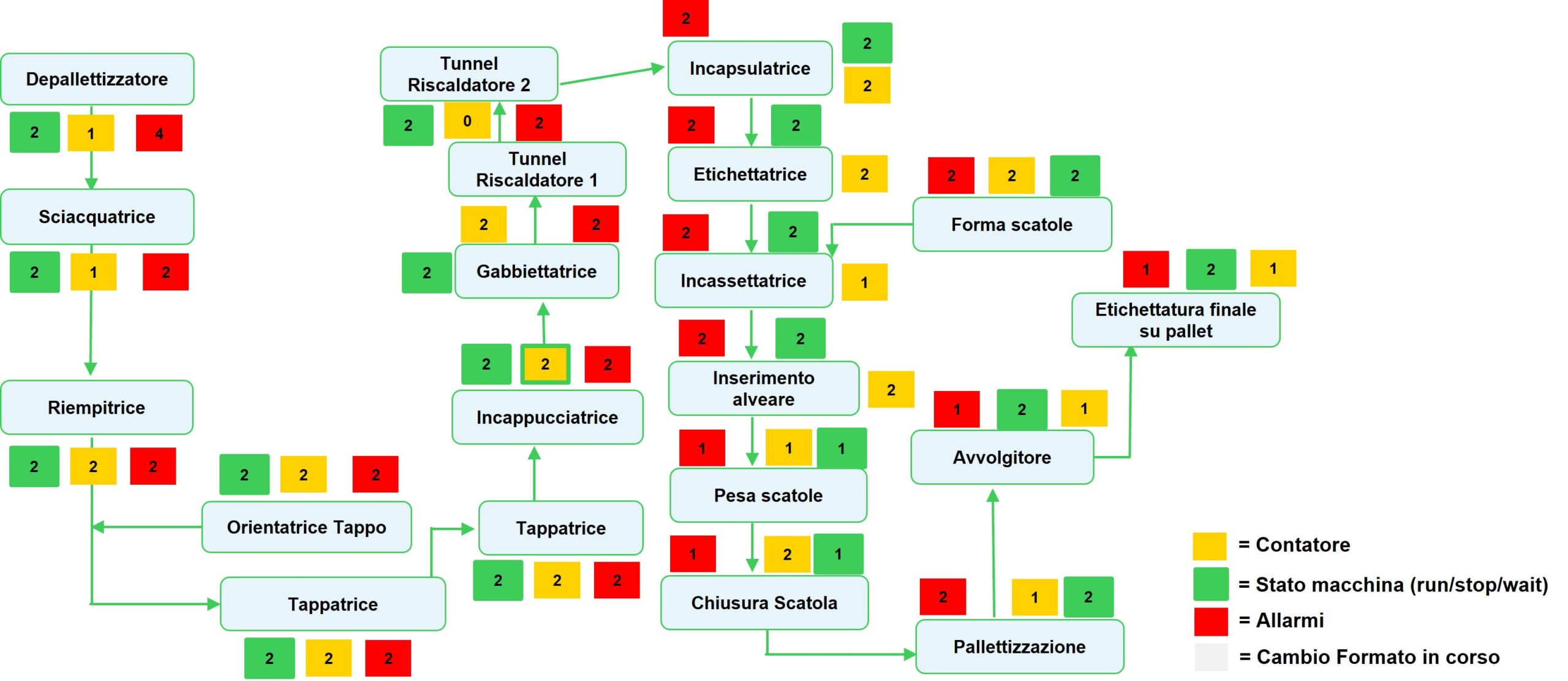 La piattaforma Ecostruxure permette di monitorare qualunque passaggio della linea di imbottigliamento, restituendo una istantanea del funzionamento di ciascun asset in termini di stato macchina, allarmi, stadio di lavoro. Una dashboard intuitiva, basata su indici colorimetrici – rosso, verde, giallo – permette una veloce analisi di linea.