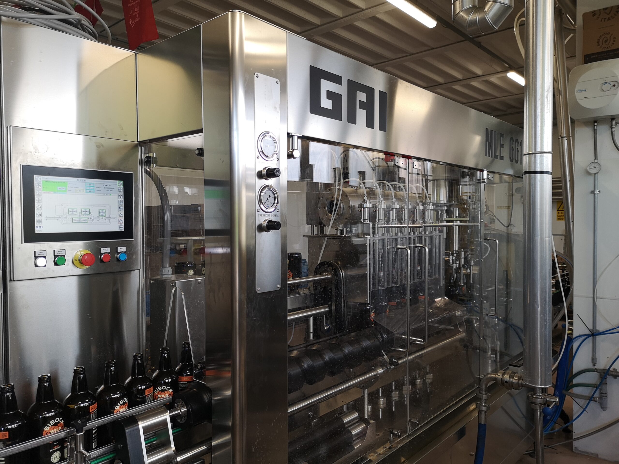 Le bottiglie provenienti dal depallettizzatore passano prima attraverso l’etichettatrice ENOS, poi dalla riempitrice e infine vengono tappate. La riempitrice attuale è una GAI a 6 teste da 1000 bottiglie da 33 cl/ora, con possibilità di assistenza da remoto in caso di guasti. «Si tratta di una macchina automatica – spiega Rudy Casas Calvo, responsabile del reparto – che permette di eseguire molti controlli a monitor, in particolare sulle fasi di riempimento e sgasatura. Per mantenere alta la qualità, dobbiamo porre grandissima attenzione alla pressione all’interno della bottiglia, ma anche alla temperatura a cui imbottigliamo, che dipende da quella dell’ambiente. In pratica per ogni tipologia di birra e formato che confezioniamo, e a seconda della stagione in cui si imbottiglia, stiamo individuando i migliori parametri di processo da applicare, elencandoli in “ricette” che, inserite nel software della macchina, permettono la standardizzazione del processo». Anche per l’infustamento si sta lavorando all’automatizzazione, prodotto per prodotto.