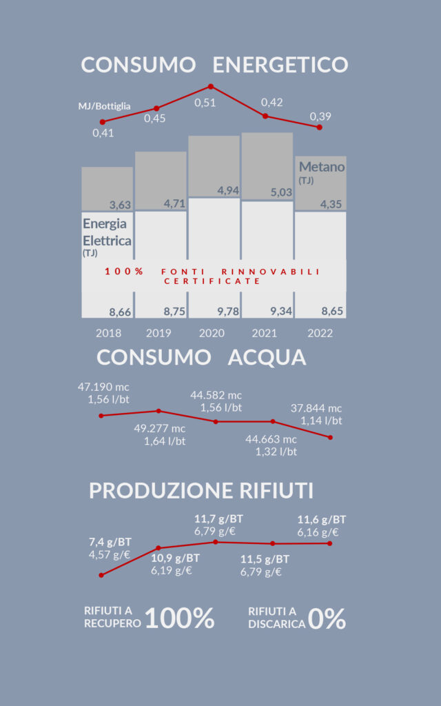 Un notevole passo avanti è stato compiuto con il progetto ZeroWaste to Landfill, riducendo gli scarti e potenziando il riciclo, come il riutilizzo di 43.000 m3 di acqua di processo negli ultimi cinque anni, la riduzione del 27% del consumo di acqua per bottiglia rispetto al 2020. Grazie all’adozione di tecnologie per il risparmio energetico (recupero calorie dalla climatizzazione e dai processi produttivi), il recupero dell’acqua di processo e il sistema di microfiltrazione hanno consentito riduzioni rilevanti nei consumi, mantenendosi ben entro i 2 l/bt, raggiungendo nel 2022 1,14 l/bte. Contemporaneamente, dal 2019, la produzione di rifiuti è quantitativamente invariata, tra 11 e 12 g/bt. E’ stato così raggiunto l’obiettivo del 100% dei rifiuti destinati a recupero e non smaltiti in discarica, oltre al mantenimento della fornitura di energia elettrica proveniente al 100% da fonti rinnovabili certificate o con garanzia d’origine. A partire dal 2021, grazie ad una serie di interventi di efficientamento, i consumi energetici pro bottiglia hanno subito una riduzione del 24%, in particolare per la riduzione dell’uso di metano. Nel 2022 si è registrata una riduzione del 15% dei consumi a fronte di un aumento della produzione.