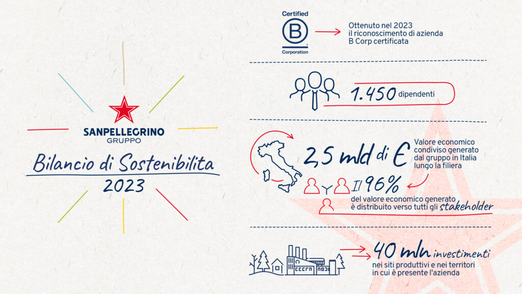 Il modello operativo di Sanpellegrino fa perno sull’adozione di strategie volte alla creazione di valore condiviso: l’azienda è, infatti, orientata a favorire una crescita sostenibile attraverso progetti che contribuiscono a promuovere lo sviluppo economico e sociale delle comunità in cui il Gruppo è presente. Il valore economico condiviso generato da Sanpellegrino nel nostro Paese nel 2022 è stato pari a 2,5 miliardi di euro, ben il 10% in più rispetto al 2021, pari quasi a 3 volte il fatturato del Gruppo e allo 0,13% del PIL italiano nel 2022. Il 96% di questa cifra è stata distribuita agli stakeholder esterni e solo il 4% è stato trattenuto all’interno dell’azienda.