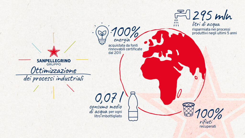 I processi di imbottigliamento di tutti gli stabilimenti mirano alla massima riduzione degli impatti ambientali, a partire proprio dal consumo di acqua. Una gestione responsabile e sostenibile di questa risorsa parte proprio dai progetti per la riduzione, il riutilizzo e il riciclo dell’acqua impiegata in tutte le attività produttive, che hanno permesso al Gruppo di risparmiare negli ultimi 5 anni 295 milioni di litri. È così che nel 2022 si è arrivati a consumare 0,07 litri di acqua di processo per ogni litro di acqua minerale imbottigliato, in diminuzione rispetto agli 0,08 litri di acqua utilizzati nel 2021.