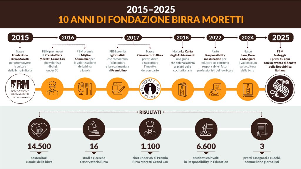 Dal 2005 al 2015 si sono susseguiti una serie di eventi, dalla nascita dell’Osservatorio Birra supportato da autorevoli realtà del Food, alla Nazionale del Gusto, dal Premiolino del 2009 alla prima edizione del Premio Grand Cru del 2011. Dunque, dalla promozione della cultura alimentare allo spazio per i giovani. Nel mezzo, sempre, la birra. Una certezza e una presenza fissa. Ma, con EXPO 2015, qualcosa è cambiato. La rassegna universale di Milano ha delineato la fine e l’inizio, uno spartiacque tra il passato e il futuro. Birra Moretti diventa Birra Ufficiale dell’evento internazionale. E da lì, quindi, comincia il decollo. Di lì a breve sarebbe nata la Fondazione, con un obiettivo ben preciso: inserirsi all’interno della cultura italiana con uno statuto suo, operando senza fini di lucro, per il raggiungimento delle finalità di pubblica utilità. Per migliorare la conoscenza della birra in Italia.